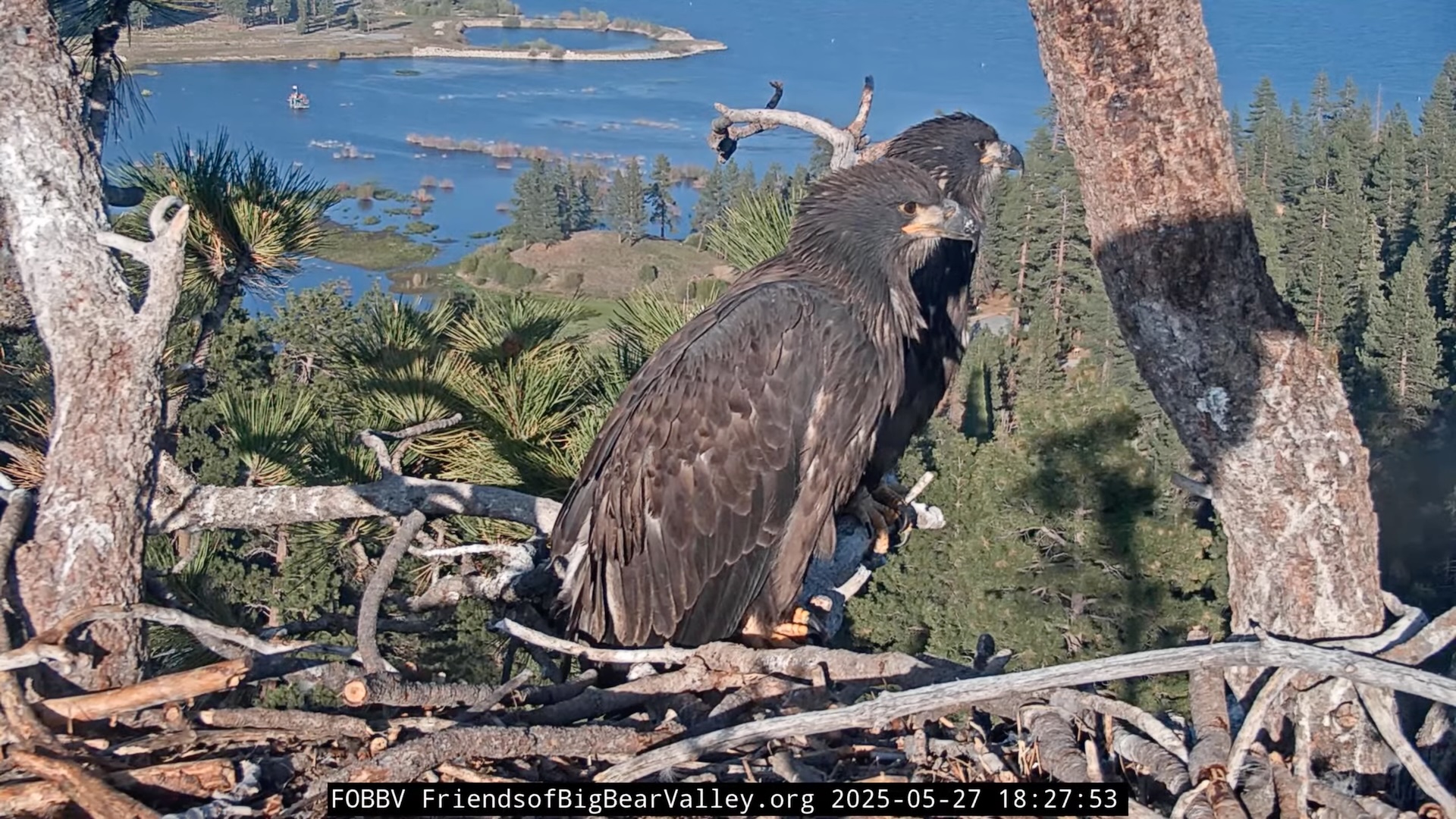 I always enjoy a nest with 2 or 3 siblings, because it's fun to watch their interactions with each other when they get older and the parents aren't around much. These two mostly get along, with a very occasional brief fight. I also love how they watch each other so intensely when one of them starts jumping and flapping a lot, or playing with a stick—they're so keen to observe and learn from each other. I also love how fluffy these chicks always look.
